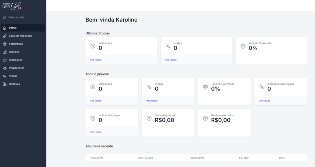 Após a finalização do cadastro e aprovação, você terá acesso a um painel com todas as informações necessárias tanto para gerar seu link quanto para acompanhar seu desempenho no mês corrido.